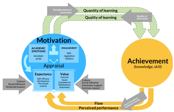 - Omgekeerd benadrukken tal van empirisch gevalideerde motivatiemodellen dat als leerlingen succesvol zijn in het uitvoeren van leertaken en nieuwe kennis vergaren, hun welbevinden op school kan verhogen. Omgekeerd stellen diezelfde motivatiemodellen dat positieve verwachtingen van leerlingen (bv. de verwachting om succesvol te kunnen zijn, de verwachting om een taak in een veilige, sociaal lonende omgeving te kunnen uitvoeren) de kans vergroot dat ze gemotiveerd en geconcentreerd aan de slag gaat met een leertaak. De meeste motivatiemodellen zijn cyclisch: de pijlen tussen socio-affectieve factoren en prestaties wijzen in de twee richtingen. Het empirisch gevalideerde model van TuongVan Vu e.a. (2021) spreekt van motivation-achievement-cycles: in hun model zie je race-auto’s aan topsnelheid rondjes rijden langs de stations “academic emotions/motivation/self-efficacy” en “achievement (knowledge/skill)”.